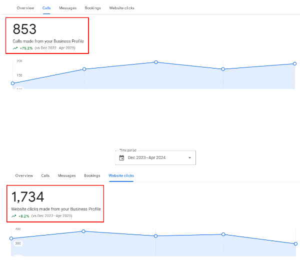 - Google Business Profile interactions totalled 2135 over four months, with 853 calls and 1734 website clicks, indicating increased brand engagement and customer inquiries.